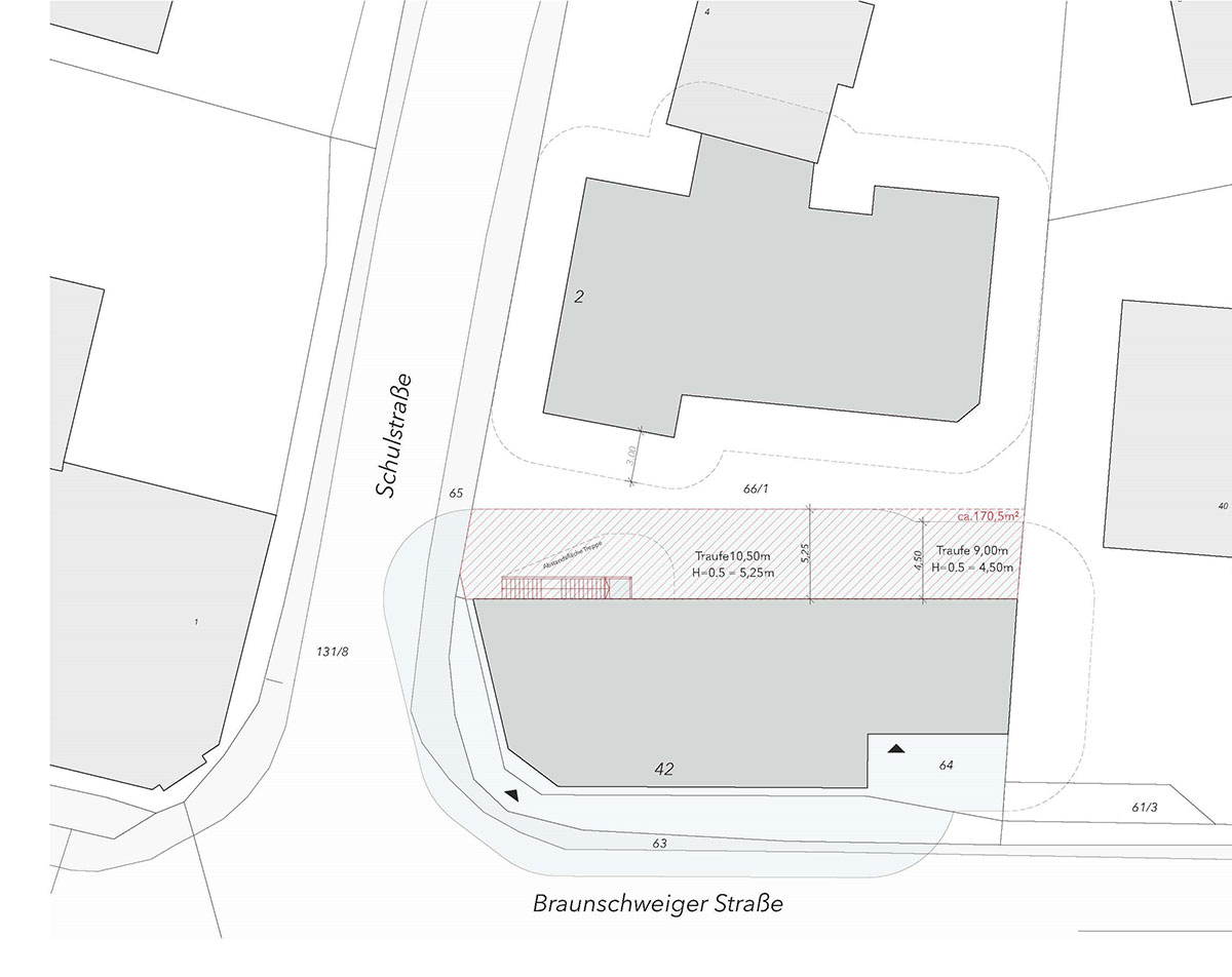 Vor dem einreichen des Bauantrags ist die Abstandsfläche mit dem Nachbarn zu klären (Grenzbebauung). Die Fläche brauchen wir für einen Rettungsweg.